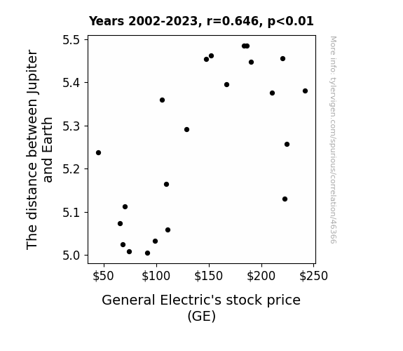 This means 41.7% of the change in the one variable (i.e., General Electric's stock price (GE)) is predictable based on the change in the other (i.e., The distance between Jupiter and Earth) over the 22 years from 2002 through 2023.