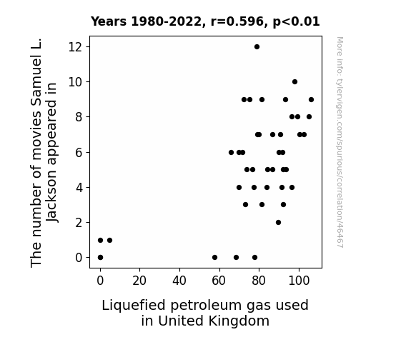This means 35.6% of the change in the one variable (i.e., Liquefied petroleum gas used in United Kingdom) is predictable based on the change in the other (i.e., The number of movies Samuel L. Jackson appeared in) over the 43 years from 1980 through 2022.