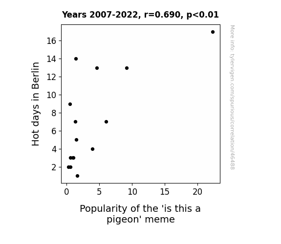 This means 47.6% of the change in the one variable (i.e., Popularity of the 'is this a pigeon' meme) is predictable based on the change in the other (i.e., Hot days in Berlin) over the 15 years from 2007 through 2022.