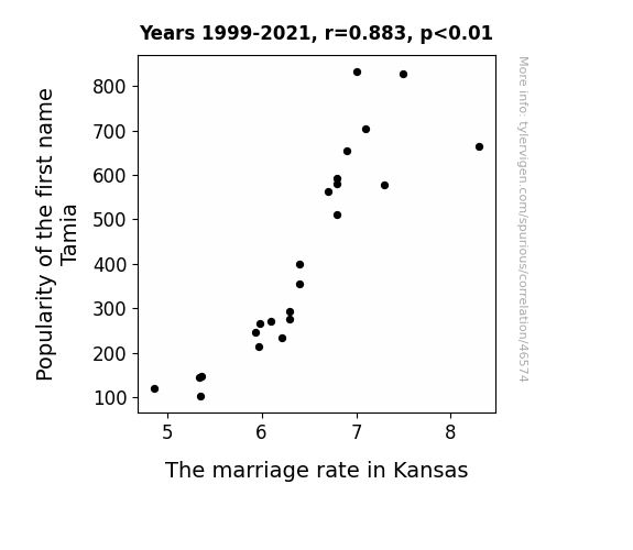 This means 78% of the change in the one variable (i.e., The marriage rate in Kansas) is predictable based on the change in the other (i.e., Popularity of the first name Tamia) over the 23 years from 1999 through 2021.