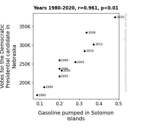 This means 92.4% of the change in the one variable (i.e., Gasoline pumped in Solomon Islands) is predictable based on the change in the other (i.e., Votes for the Democratic Presidential candidate in Nebraska) over the 11 years from 1980 through 2020.