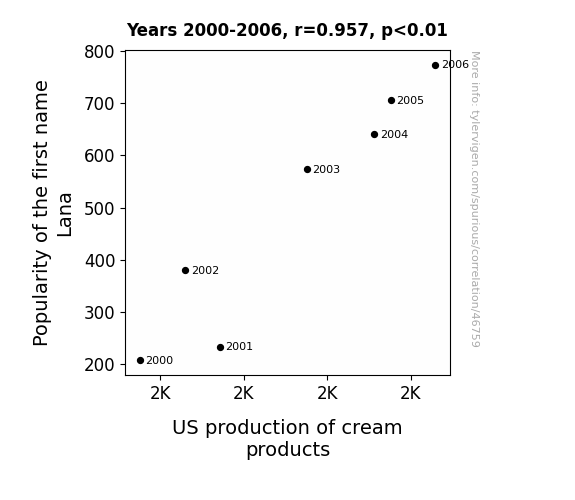 This means 91.6% of the change in the one variable (i.e., US production of cream products) is predictable based on the change in the other (i.e., Popularity of the first name Lana) over the 7 years from 2000 through 2006.