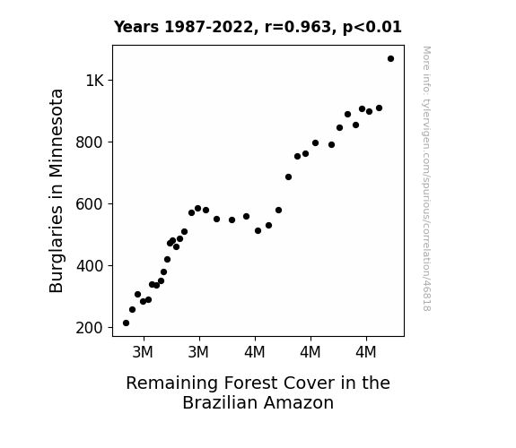 This means 92.8% of the change in the one variable (i.e., Remaining Forest Cover in the Brazilian Amazon) is predictable based on the change in the other (i.e., Burglaries in Minnesota) over the 36 years from 1987 through 2022.