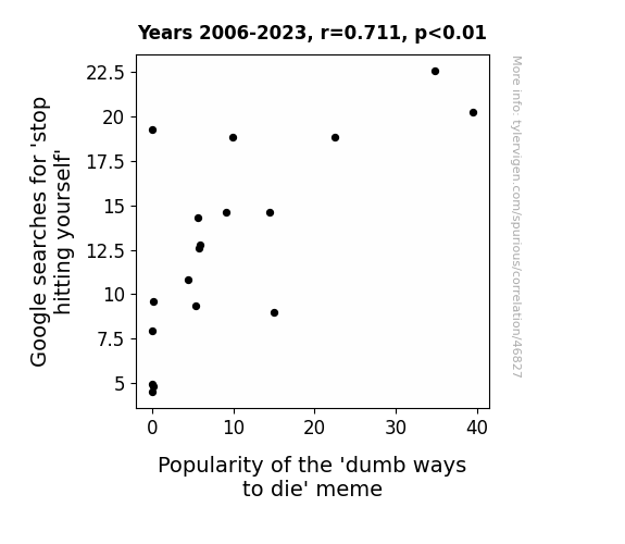 This means 50.6% of the change in the one variable (i.e., Popularity of the 'dumb ways to die' meme) is predictable based on the change in the other (i.e., Google searches for 'stop hitting yourself') over the 18 years from 2006 through 2023.