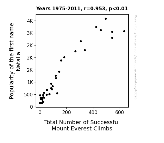 This means 90.8% of the change in the one variable (i.e., Total Number of Successful Mount Everest Climbs) is predictable based on the change in the other (i.e., Popularity of the first name Natalia) over the 37 years from 1975 through 2011.