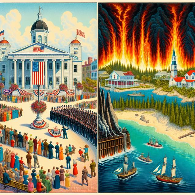 Prompt: In a bustling town in Maine, people proudly cast their votes for the Democratic Presidential candidate. The air buzzed with excitement, creating an energetic atmosphere. As the political fervor spread, it inexplicably drifted southward to The Bahamas. In a quiet corner of the island, dormant fossil fuel reserves suddenly became agitated. Before anyone knew it, the fuels ignited, adding unexpected energy to the air. The political sway from Maine sparked an increase in fossil fuel use in The Bahamas, a surprising and incendiary turn of events. Generated Image Prompt: A vibrant town square in Maine, with flags waving and people lined up to cast their votes, while in the background, an island in The Bahamas with a quiet corner where fossil fuel reserves suddenly burst into flames, adding an unexpected fiery energy to the scene. The depiction should include only scenes, people, and objects, it should not include text or speech bubbles.