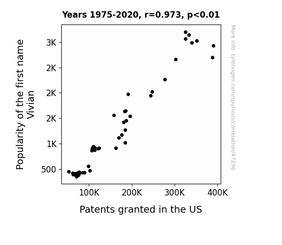 This means 94.6% of the change in the one variable (i.e., Patents granted in the US) is predictable based on the change in the other (i.e., Popularity of the first name Vivian) over the 46 years from 1975 through 2020.