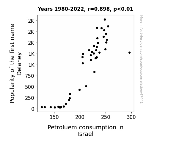 This means 80.6% of the change in the one variable (i.e., Petroluem consumption in Israel) is predictable based on the change in the other (i.e., Popularity of the first name Delaney) over the 43 years from 1980 through 2022.