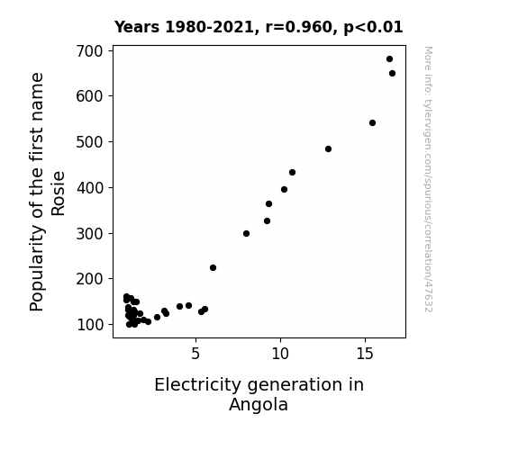 This means 92.2% of the change in the one variable (i.e., Electricity generation in Angola) is predictable based on the change in the other (i.e., Popularity of the first name Rosie) over the 42 years from 1980 through 2021.