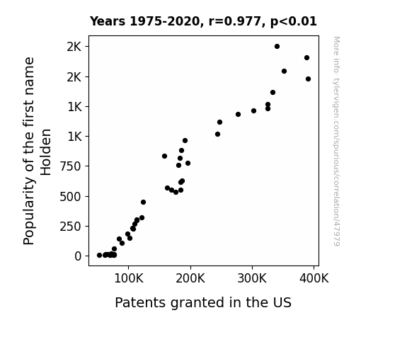 This means 95.5% of the change in the one variable (i.e., Patents granted in the US) is predictable based on the change in the other (i.e., Popularity of the first name Holden) over the 46 years from 1975 through 2020.