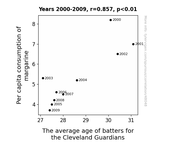This means 73.4% of the change in the one variable (i.e., The average age of batters for the Cleveland Guardians) is predictable based on the change in the other (i.e., Per capita consumption of margarine) over the 10 years from 2000 through 2009.