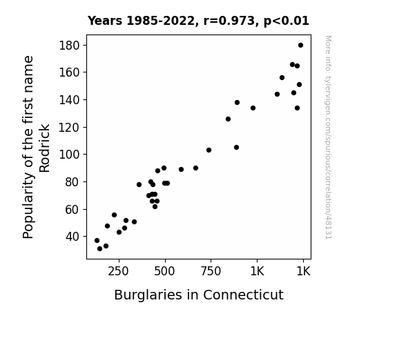 This means 94.7% of the change in the one variable (i.e., Burglaries in Connecticut) is predictable based on the change in the other (i.e., Popularity of the first name Rodrick) over the 38 years from 1985 through 2022.