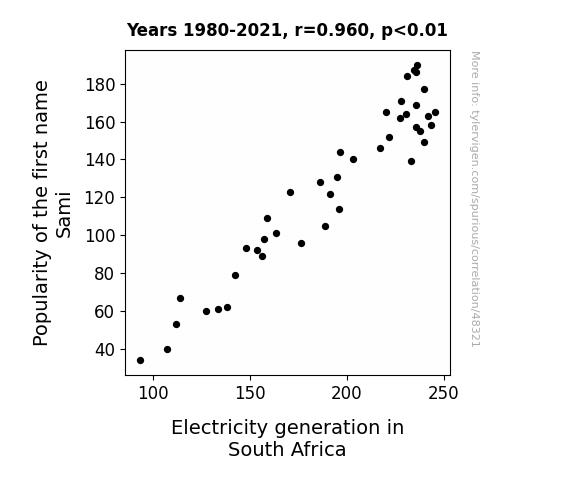 This means 92.2% of the change in the one variable (i.e., Electricity generation in South Africa) is predictable based on the change in the other (i.e., Popularity of the first name Sami) over the 42 years from 1980 through 2021.