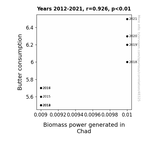 This means 85.7% of the change in the one variable (i.e., Biomass power generated in Chad) is predictable based on the change in the other (i.e., Butter consumption) over the 10 years from 2012 through 2021.