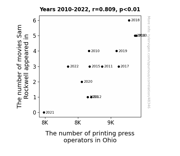 This means 65.5% of the change in the one variable (i.e., The number of printing press operators in Ohio) is predictable based on the change in the other (i.e., The number of movies Sam Rockwell appeared in) over the 13 years from 2010 through 2022.