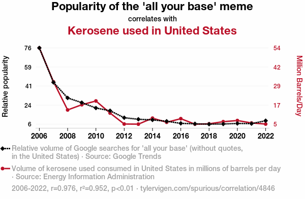 - The spurious research paper: Fueling the Fire: Exploring the Flammable Link Between 'All Your Base' Meme Popularity and Kerosene Consumption in the United States