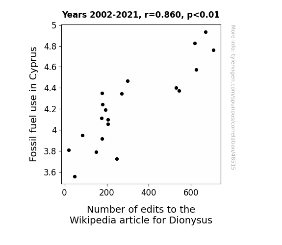 This means 74% of the change in the one variable (i.e., Number of edits to the Wikipedia article for Dionysus) is predictable based on the change in the other (i.e., Fossil fuel use in Cyprus) over the 20 years from 2002 through 2021.
