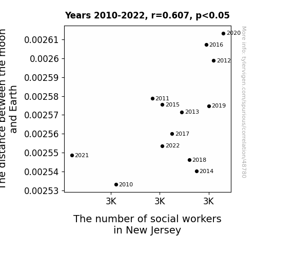 This means 36.9% of the change in the one variable (i.e., The number of social workers in New Jersey) is predictable based on the change in the other (i.e., The distance between the moon and Earth) over the 13 years from 2010 through 2022.