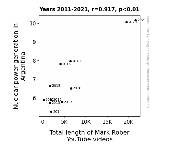 This means 84% of the change in the one variable (i.e., Total length of Mark Rober YouTube videos) is predictable based on the change in the other (i.e., Nuclear power generation in Argentina) over the 11 years from 2011 through 2021.
