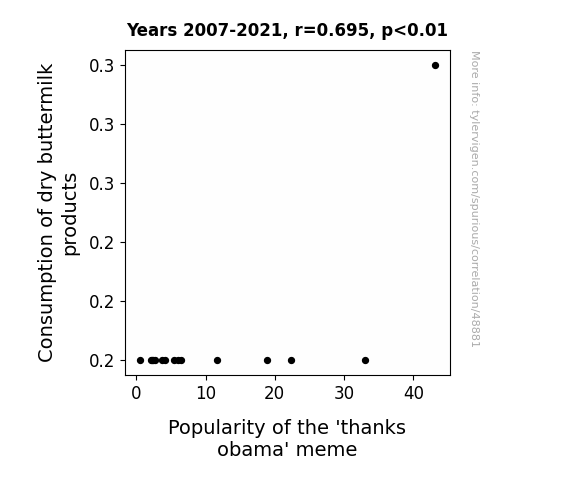 This means 48.3% of the change in the one variable (i.e., Popularity of the 'thanks obama' meme) is predictable based on the change in the other (i.e., Consumption of dry buttermilk products) over the 15 years from 2007 through 2021.