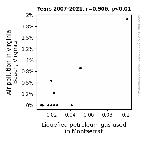 This means 82.1% of the change in the one variable (i.e., Liquefied petroleum gas used in Montserrat) is predictable based on the change in the other (i.e., Air pollution in Virginia Beach, Virginia) over the 15 years from 2007 through 2021.