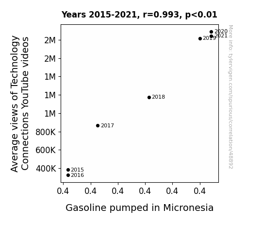 This means 98.6% of the change in the one variable (i.e., Gasoline pumped in Micronesia) is predictable based on the change in the other (i.e., Average views of Technology Connections YouTube videos) over the 7 years from 2015 through 2021.