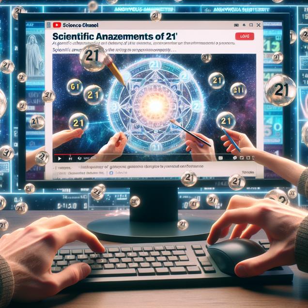 Prompt: Image Generation Prompt: Generate an image that visually connects the concepts of geeky phenomena and unexpected luck. Depict a YouTube video thumbnail for Steve Mould's video titled "The Geeky Wonders of 21" prominently displayed on a computer screen. As the viewer clicks on the video, the scene transitions to a Mega Millions lottery drawing where the number 21 is being dramatically displayed as the winning number for the third consecutive time. Capture the magical and captivating ambiance of this surprising connection, focusing on the visual elements and adding an enchanting touch to the scene. The depiction should include only scenes, people, and objects, it should not include text or speech bubbles.
