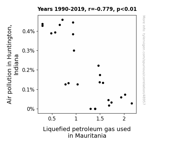 This means 60.7% of the change in the one variable (i.e., Liquefied petroleum gas used in Mauritania) is predictable based on the change in the other (i.e., Air pollution in Huntington, Indiana) over the 30 years from 1990 through 2019.