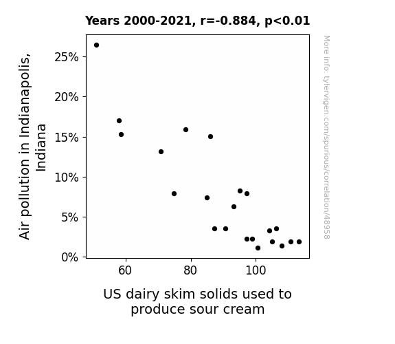 This means 78.1% of the change in the one variable (i.e., US dairy skim solids used to produce sour cream) is predictable based on the change in the other (i.e., Air pollution in Indianapolis, Indiana) over the 22 years from 2000 through 2021.