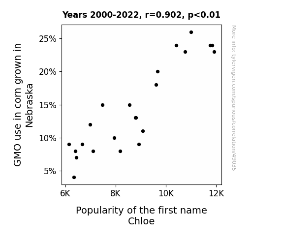 This means 81.3% of the change in the one variable (i.e., Popularity of the first name Chloe) is predictable based on the change in the other (i.e., GMO use in corn grown in Nebraska) over the 23 years from 2000 through 2022.