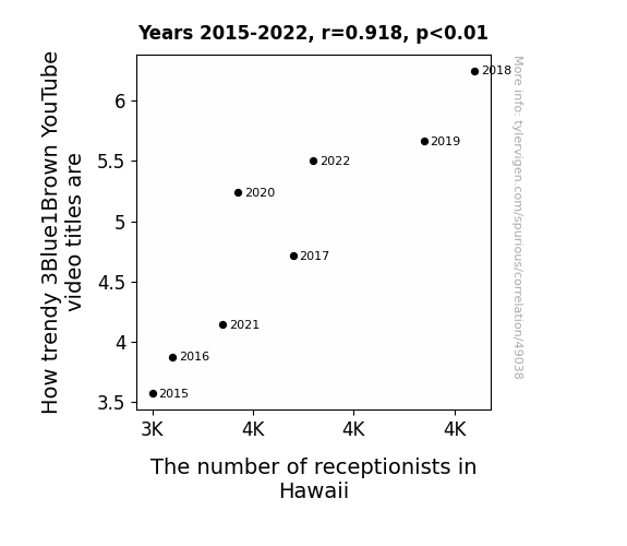 This means 84.4% of the change in the one variable (i.e., The number of receptionists in Hawaii) is predictable based on the change in the other (i.e., How trendy 3Blue1Brown YouTube video titles are) over the 8 years from 2015 through 2022.