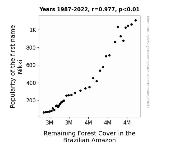 This means 95.5% of the change in the one variable (i.e., Remaining Forest Cover in the Brazilian Amazon) is predictable based on the change in the other (i.e., Popularity of the first name Nikki) over the 36 years from 1987 through 2022.