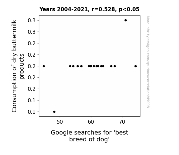 This means 27.9% of the change in the one variable (i.e., Google searches for 'best breed of dog') is predictable based on the change in the other (i.e., Consumption of dry buttermilk products) over the 18 years from 2004 through 2021.