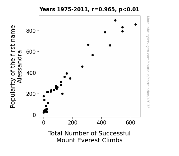 This means 93.2% of the change in the one variable (i.e., Total Number of Successful Mount Everest Climbs) is predictable based on the change in the other (i.e., Popularity of the first name Alessandra) over the 37 years from 1975 through 2011.