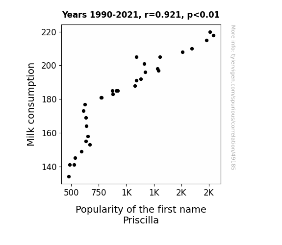 This means 84.8% of the change in the one variable (i.e., Popularity of the first name Priscilla) is predictable based on the change in the other (i.e., Milk consumption) over the 32 years from 1990 through 2021.