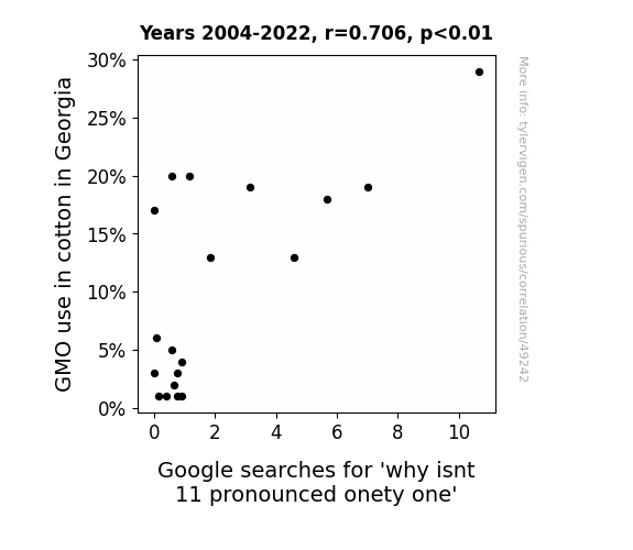 This means 49.8% of the change in the one variable (i.e., Google searches for 'why isnt 11 pronounced onety one') is predictable based on the change in the other (i.e., GMO use in cotton in Georgia) over the 19 years from 2004 through 2022.
