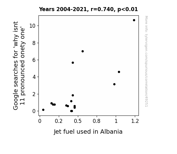 This means 54.7% of the change in the one variable (i.e., Jet fuel used in Albania) is predictable based on the change in the other (i.e., Google searches for 'why isnt 11 pronounced onety one') over the 18 years from 2004 through 2021.