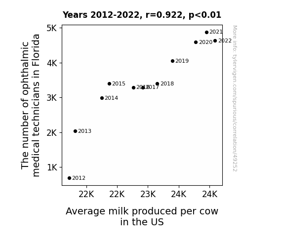 This means 85% of the change in the one variable (i.e., Average milk produced per cow in the US) is predictable based on the change in the other (i.e., The number of ophthalmic medical technicians in Florida) over the 11 years from 2012 through 2022.