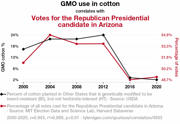 This means 88.9% of the change in the one variable (i.e., Votes for the Republican Presidential candidate in Arizona) is predictable based on the change in the other (i.e., GMO use in cotton) over the 6 years from 2000 through 2020.