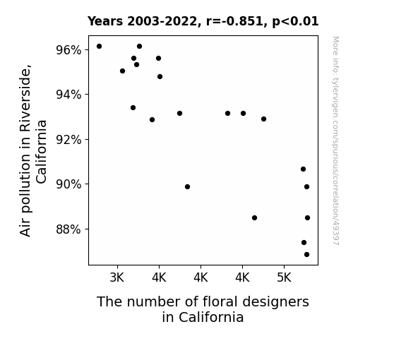 This means 72.5% of the change in the one variable (i.e., The number of floral designers in California) is predictable based on the change in the other (i.e., Air pollution in Riverside, California) over the 20 years from 2003 through 2022.
