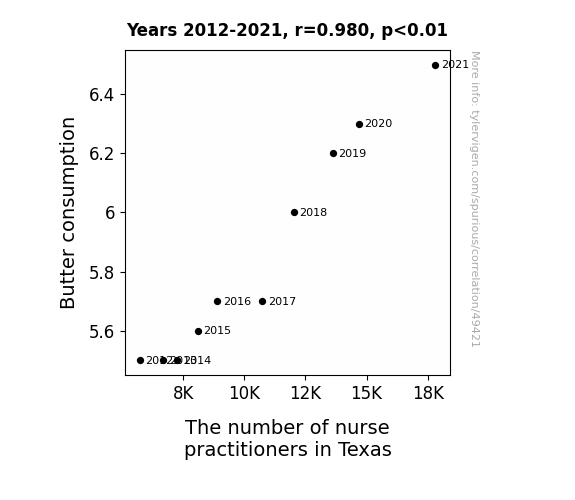 This means 96% of the change in the one variable (i.e., The number of nurse practitioners in Texas) is predictable based on the change in the other (i.e., Butter consumption) over the 10 years from 2012 through 2021.