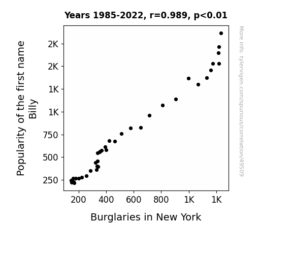 This means 97.9% of the change in the one variable (i.e., Burglaries in New York) is predictable based on the change in the other (i.e., Popularity of the first name Billy) over the 38 years from 1985 through 2022.