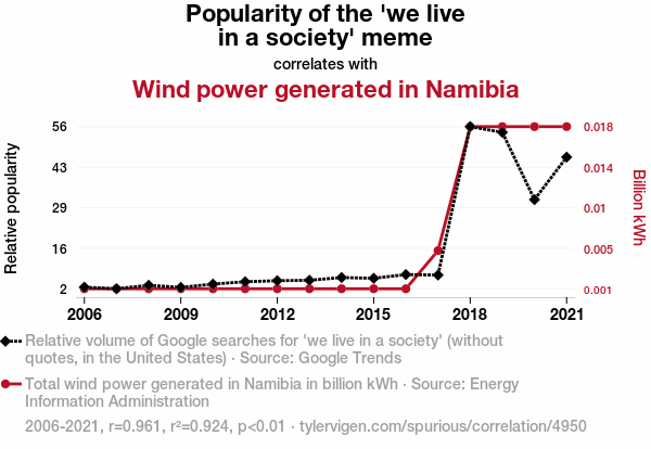 - The spurious research paper: We Live in a Current-Generating Society: The Shocking Connection Between 'We Live in a Society' Meme Popularity and Wind Power Generated in Namibia