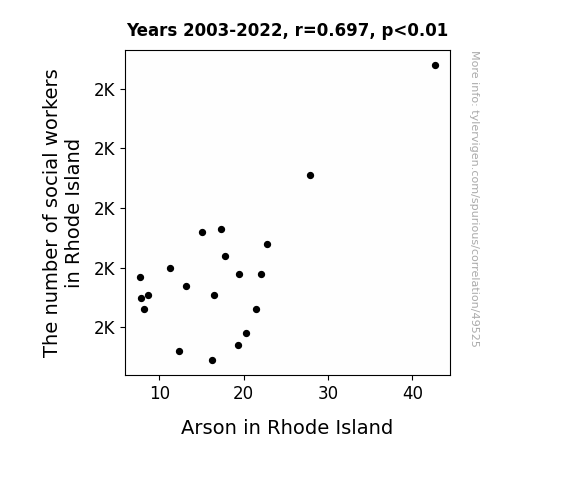 This means 48.5% of the change in the one variable (i.e., Arson in Rhode Island) is predictable based on the change in the other (i.e., The number of social workers in Rhode Island) over the 20 years from 2003 through 2022.