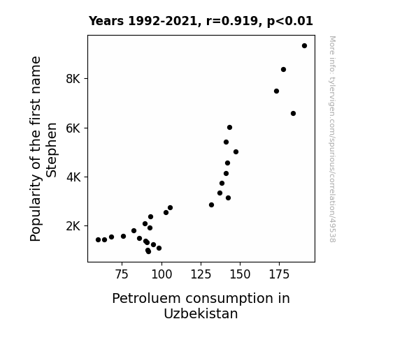 This means 84.4% of the change in the one variable (i.e., Petroluem consumption in Uzbekistan) is predictable based on the change in the other (i.e., Popularity of the first name Stephen) over the 30 years from 1992 through 2021.