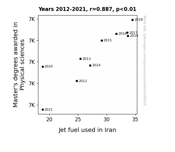 This means 78.7% of the change in the one variable (i.e., Jet fuel used in Iran) is predictable based on the change in the other (i.e., Master's degrees awarded in Physical sciences) over the 10 years from 2012 through 2021.