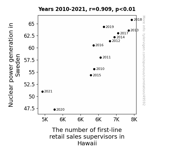 This means 82.7% of the change in the one variable (i.e., The number of first-line retail sales supervisors in Hawaii) is predictable based on the change in the other (i.e., Nuclear power generation in Sweden) over the 12 years from 2010 through 2021.