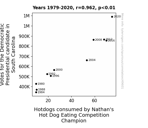 This means 92.5% of the change in the one variable (i.e., Hotdogs consumed by Nathan's Hot Dog Eating Competition Champion) is predictable based on the change in the other (i.e., Votes for the Democratic Presidential candidate in South Carolina) over the 11 years from 1979 through 2020.