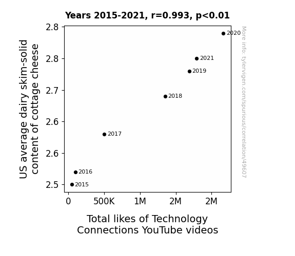 This means 98.6% of the change in the one variable (i.e., Total likes of Technology Connections YouTube videos) is predictable based on the change in the other (i.e., US average dairy skim-solid content of cottage cheese) over the 7 years from 2015 through 2021.