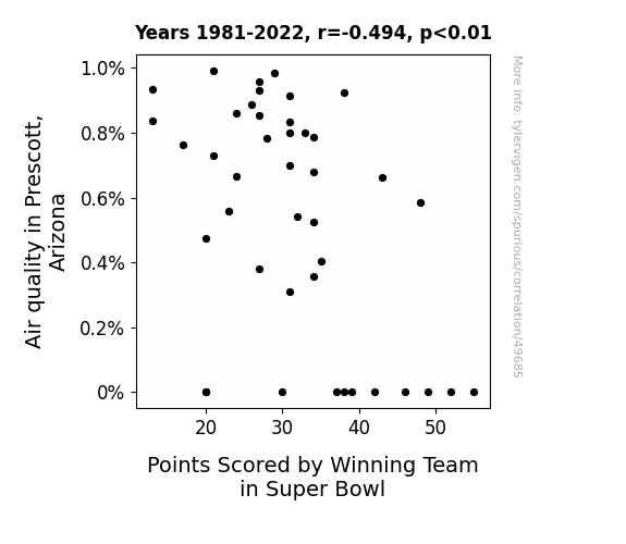 This means 24.4% of the change in the one variable (i.e., Points Scored by Winning Team in Super Bowl) is predictable based on the change in the other (i.e., Air quality in Prescott, Arizona) over the 42 years from 1981 through 2022.